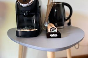In jedem Zimmer gibt es einen Kühlschrank, einen Wasserkocher für Tee und eine Kaffeemaschine für Lavazza-Kapseln.