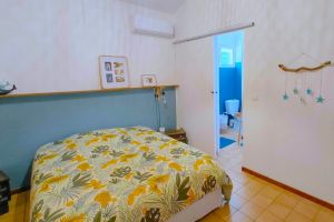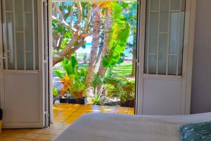 Und auf der zum Meer zugewandten Seite befindet sich das dritte Schlafzimmer mit eigenem Bad und Toilette. Auch hier hat das Bett 140 x 200 cm. Hier kann man die Flügeltüren öffnen und die Terrasse geht direkt in den Garten. Das ist wirklich schön.