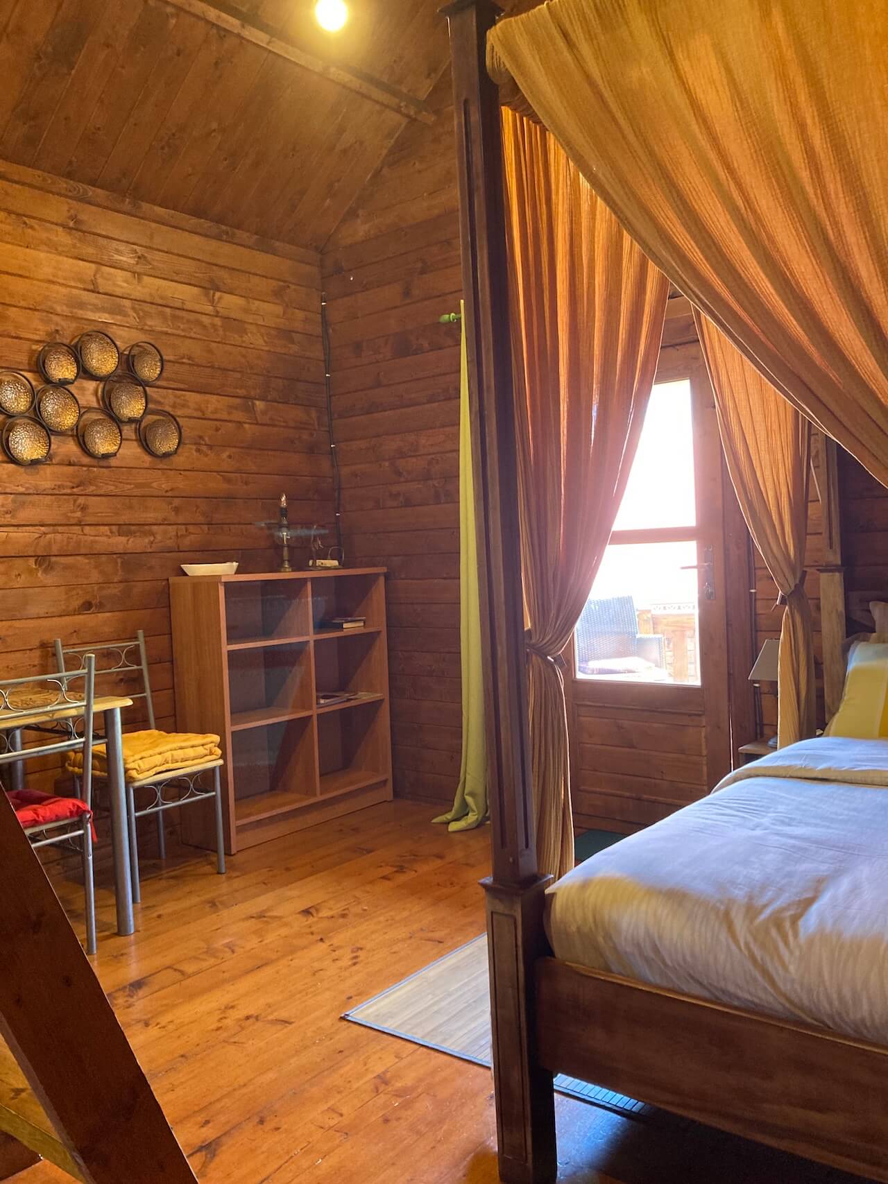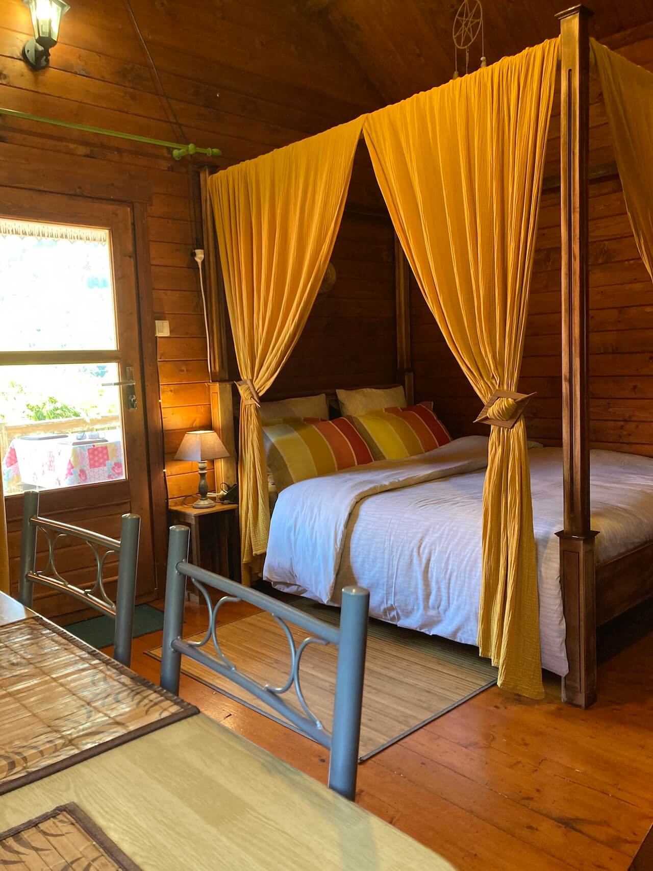 In einem der Bungalows gibt es jetzt an dieser Stelle ein Bett mit Baldachin für zwei Personen (140 x 200)