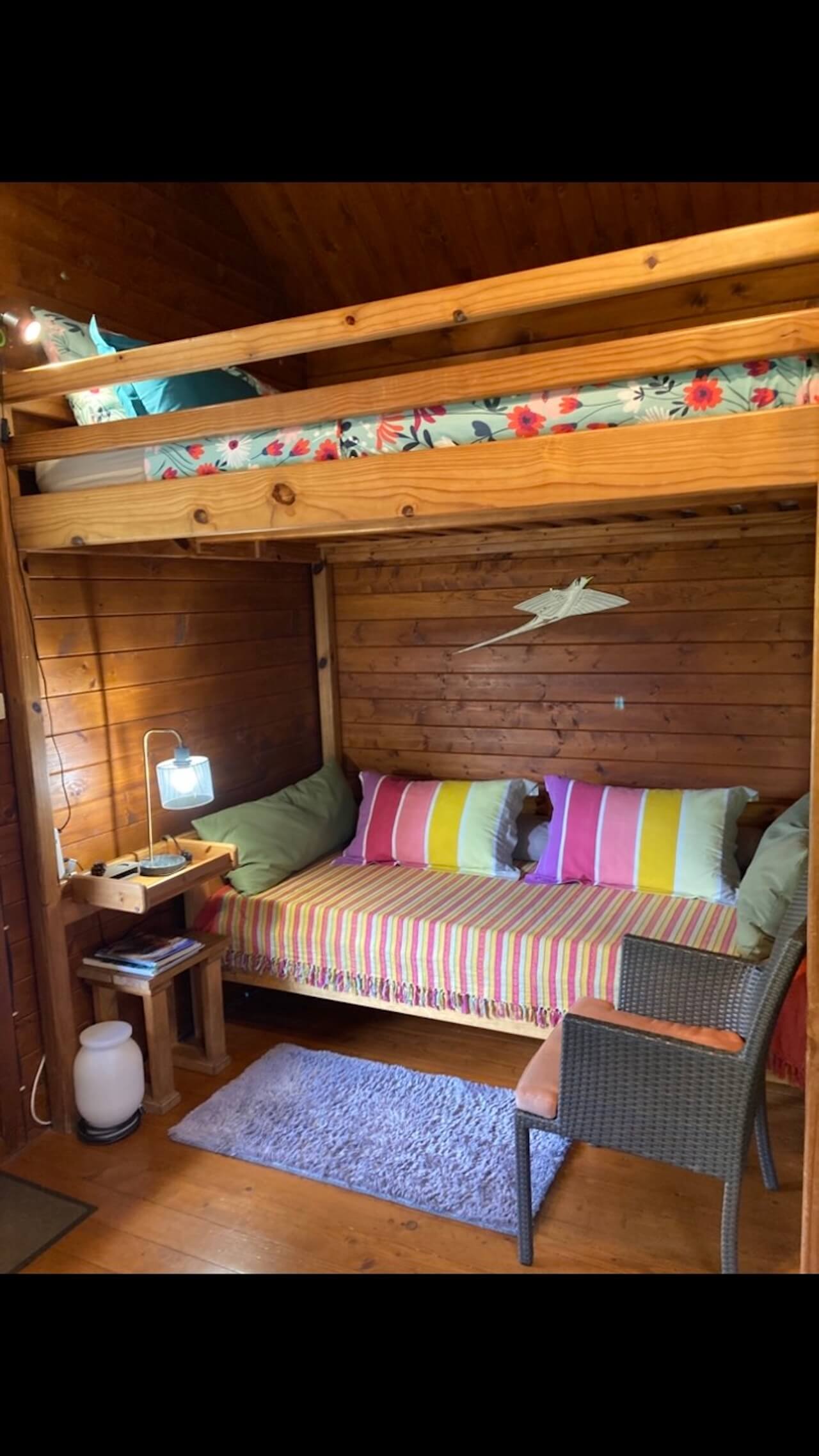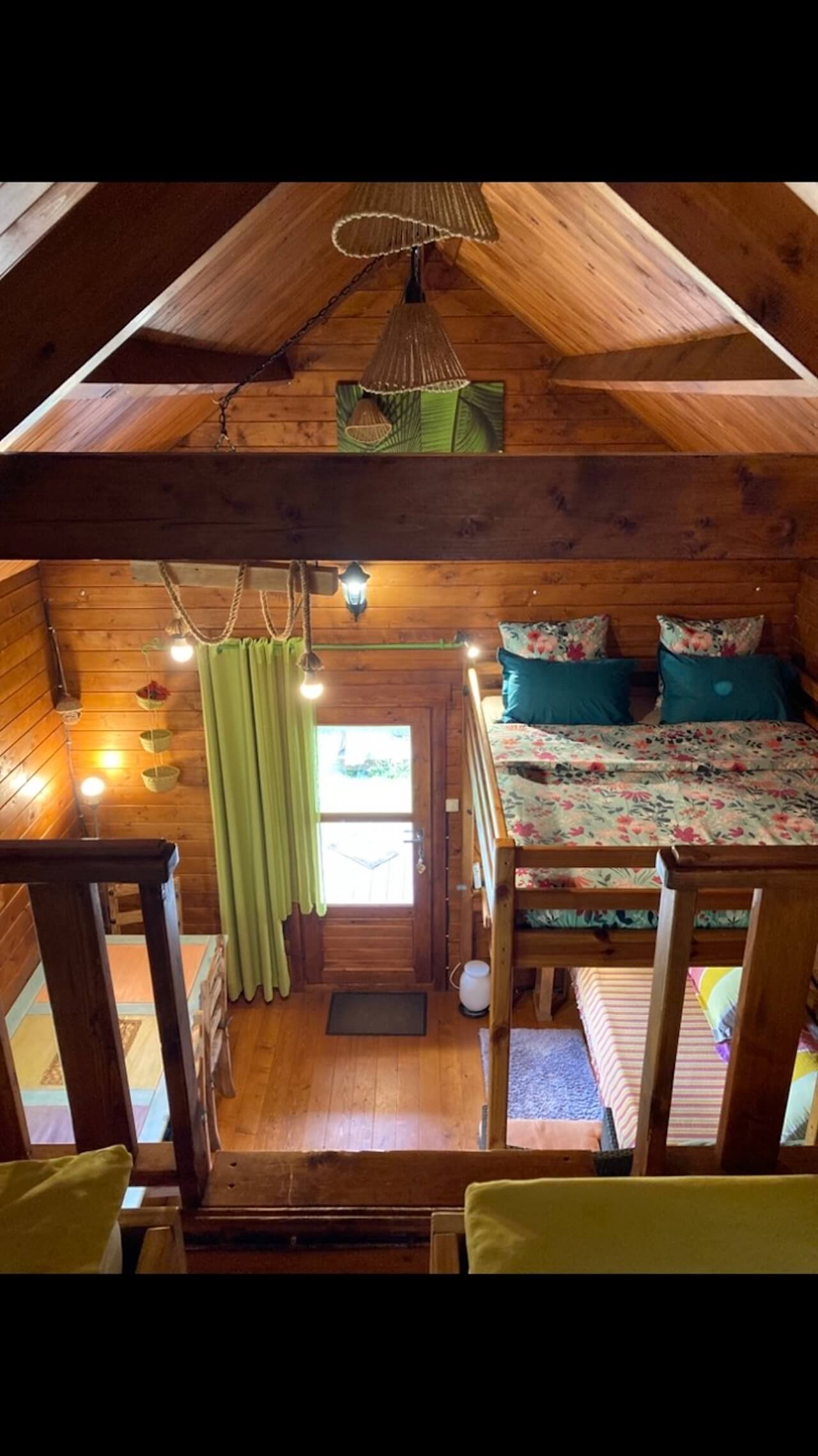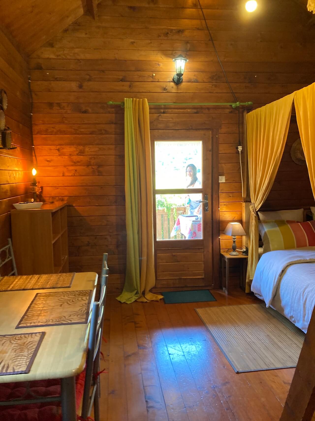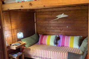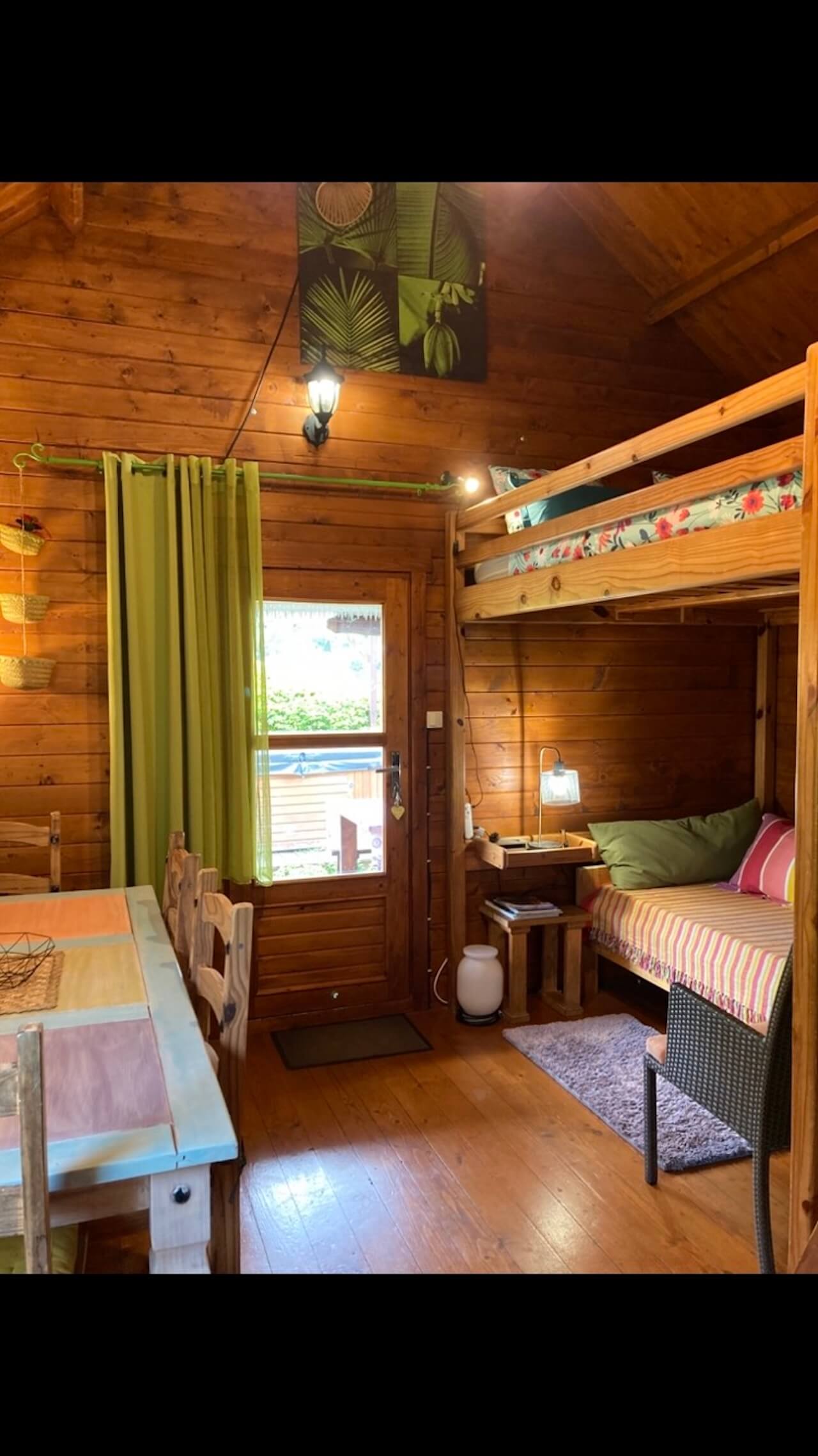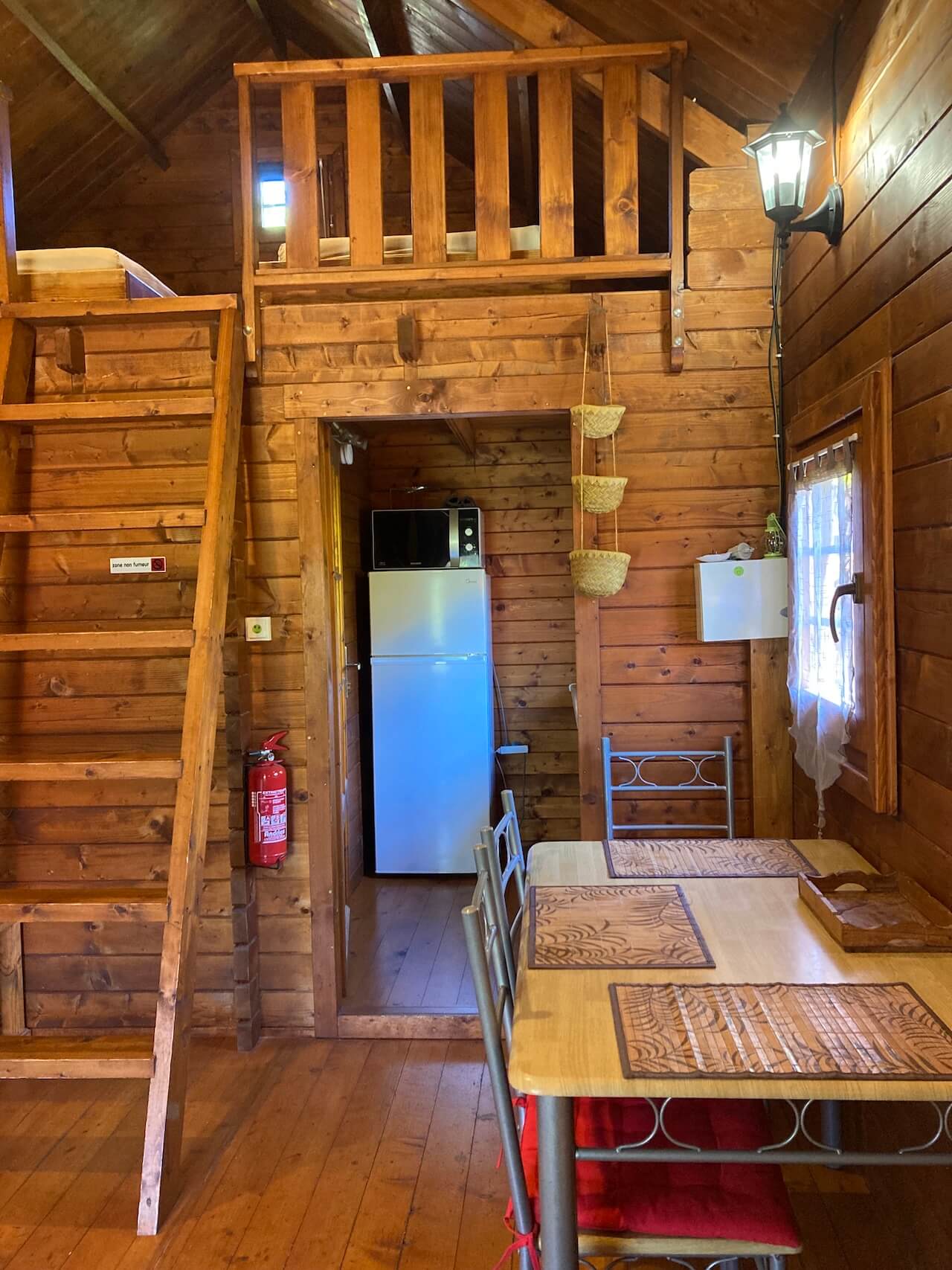 Die Holzhütten bestehen im großen und ganzen aus einem Raum und sind alle ähnlich eingerichtet. Von der überdachten Holzterrasse tritt man ein und hat rechts ein Stockbett für insgesamt 3 Personen (oben 2: 160x200, unten 1: 90x200).