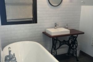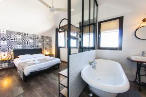 Zwei Zimmer sind für je zwei Personen. Das Bett hat 140 cm Breite und es gibt einen Kleiderschrank und Nachttische. Eines dieser beiden Zimmer hat als Besonderheit ein Bad mit einer nostalgischen Badewanne und das Badezimmer ist mit einer Glaswand vom Schlafraum getrennt.