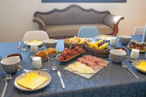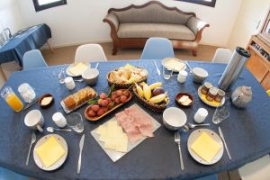 Zum Frühstück gibt es Tee oder Kaffee oder auch heiße Schokolade, dann Baguette mit Butter und selbstgemachte Marmelade und etwas Süßes sowie Früchte und Saft. Und - das wird die deutschsprechenden Gäste freuen: es gibt auch Käse und Wurstwaren sowie selbstgemachten Joghurt.