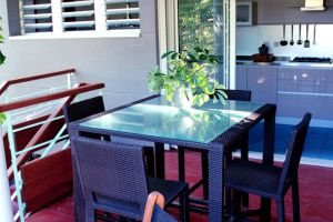 Das Appartement liegt nicht einsehbar im 1.Stock eines separat hinter dem Haupthaus gelegenen Gebäudes. Unter der Wohnung sind drei Stellplätze, davon einer für die Gäste. Seitlich führt eine Treppe nach oben direkt auf die hübsche Terrasse des Wohnung. Von hier hat man einen Blick auf umliegenden Gärten und das Haus der Gastgeber.