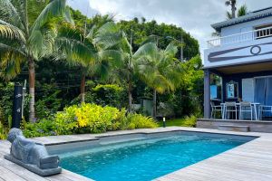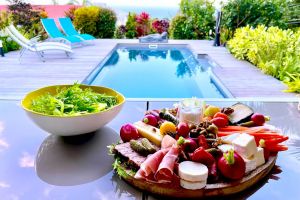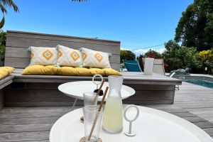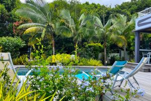 Der gepflegte, im Winter auch beheizte Salzwasser-Pool liegt vor dem Haus im Garten mit vielen tropischen Pflanzen. Am Pool gibt es Liegestühle und eine Dusche. Daneben finden Sie eine gemütliche Sitzecke zum Relaxen. Auf der überdachten Terrasse im Erdgeschoß wird das leckere Frühstück und auf Bestellung auch ein Abendessen serviert.