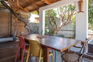 Der Tisch ist für die Gäste schön gedeckt und von dort oben kann man auch das Meer oder in der anderen Richtung die Berge sehen. Alles ist von Pflanzen umgeben und da es hier keine größeren Straßen gibt, kann man alles in Ruhe genießen.