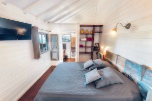 Ein Fernseher und eine Klimaanlage sind installiert. Das Highlight: eine überdachte Holzterrasse mit Blick zum Meer!