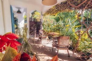 Die große Gästeterrasse, auf der das Frühstück und ggf. auch das Abendessen serviert wird, ist zum Meer hin gewandt und davor liegt der Pool. Man hat einen herrlichen Blick auf Saint Joseph und den dahinter liegenden Indischen Ozean.
