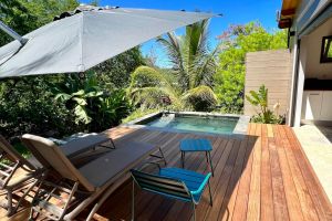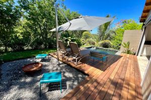 Der gepflegte kleine Relax-Pool liegt vor der Holzterrasse mit Liegestühlen und einem großen Sonnenschirm. Nicht einsehbar von außen! Im hiesigen Winter kann er sogar beheizt und als Jacuzzi benutzt werden. Abends ist er beleuchtet.