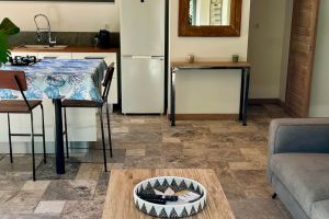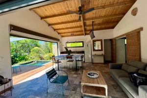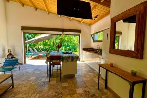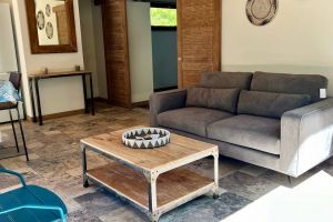Eine tolle, voll ausgestattet, moderne und offene Küche, ein im gleichen "Raum" offenes Wohnzimmer mit Couch geben Ihnen den Eindruck, Sie würden draußen leben, denn die Rolltore sind vollends geöffnet - es kann ja keiner reinschauen.