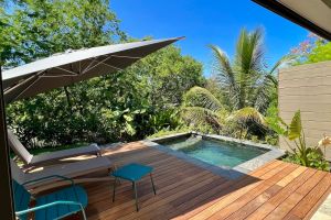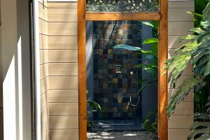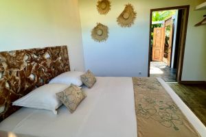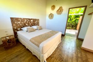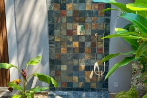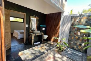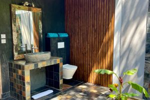 Im Anschluss liegt das große Schlafzimmer mit dem schönen Bett (160 cm) und das auch wieder offene Bad. Sie duschen im Freien, nur über dem Waschbecken und der Toilette gibt es ein Dach. Und auch hier viel Platz und ein Urwald an Pflanzen.