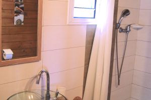 Im Badezimmer ist die Dusche, eine Toilette und das Waschbecken.