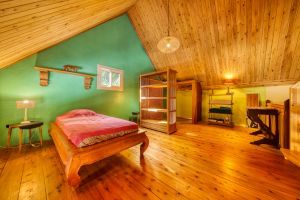 Nun steigt man hoch, auf die letzte Ebene unterm Dach. Ein zweites Bett (160x200) und eine weitere Toilette mit Sichtschutz sowie ein Waschbecken stehen Ihnen zur Verfügung. Eine Klimaanlage ist installiert und sorgt bei Bedarf für Kühlung. Das Haus hat eine hervorragende Luftzirkulation - man lässt alle Fenster und Türen geöffnet und genießt den Duft der Pflanzen und das Gezwitscher der Vögel.