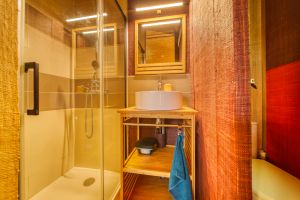 Ein paar Stufen höher liegt die Toilette und daneben das geräumige Badezimmer mit einer großen Dusche und zwei Waschbecken.