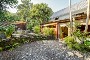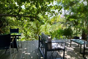 Das Haus hat einen kleinen Innenhof mit einer Sitzgarnitur. Von hier aus blicken Sie in die Baumkronen und die Natur, die Sie umgibt. Links davon befindet sich ein separater Holz-Bungalow für zwei Personen mit eigenem Bad und eigener Toilette sowie einer Klimaanlage.