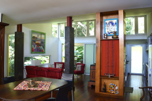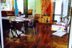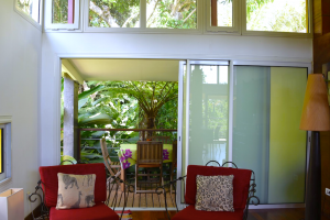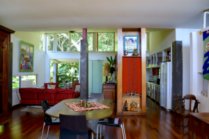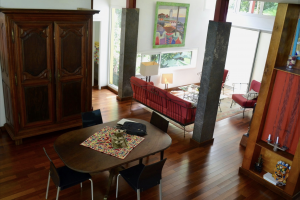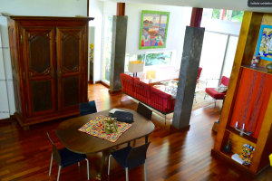 Salon: Es gibt einen großen stilvollen Salon mit einer Sitzecke, einem Esstisch für 6 Personen und herrlichen massiven Möbeln aus aller Herren Länder. Nach hinten raus liegt eine kleine Holzterrasse und auch hier hat man den Eindruck, man ist auf einem "Ausguck" im tropischen Wald, der einen umgibt.