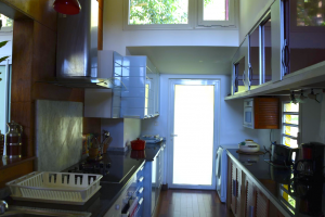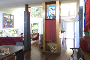 Durch die eigenwillige und moderne Architektur hat man den Eindruck, in einem Glashaus zu wohnen. Überall sieht man nach draußen, alles ist offen und luftig gestaltet: die Decke ist hoch und die Fenster sind bewusst so angelegt, dass im Haus eine natürliche Ventilation gegeben ist.