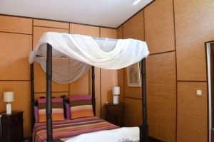 Es gibt nur ein Schlafzimmer: Ein Bett mit den Maßen 160 x 200 cm, ein Kleiderschrank und Kommoden sowie Nachttische sind vorhanden. Ein wunderschöner Glaserker vermittelt das Gefühl, in einem Baumhaus zu wohnen. Dies alles in afrikanischem Stil.
