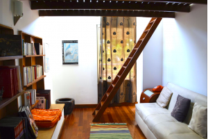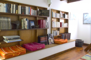 Der Salon hat auch einen durch eine kleine Wand abgetrennten Bereich: die gemütliche Bibliothek.