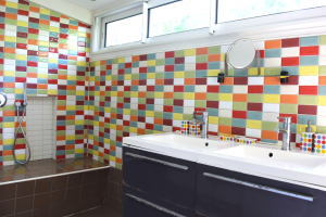 Bad und Toilette: Das große Bad ist schön gefließt. Eine moderne Dusche und zwei Waschbecken stehen zur Verfügung.