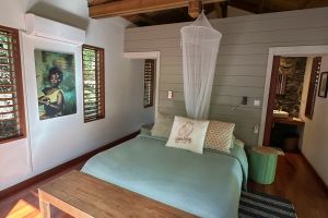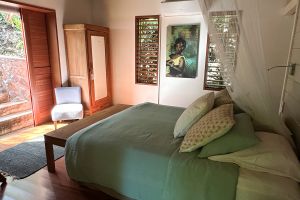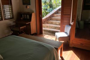 Das Besondere: vis-a-vis vom Bett eine Glastüre, die den Blick freigibt (es kann keiner reinkucken) auf den dahinterliegenden Garten am Hang, der von Jean David angelegt und gepflegt wird. Hier ein kleines Paradies mit heimischen Blumen, Palmen und Sträuchern. Auch Obstbäume gibt es und wenn die Früchte reif sind, dann dürfen Sie natürlich alles probieren.