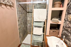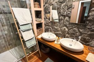 Hinter dem Bett - durch eine Natursteinmauer abgetrennt - dann rechts das Bad mit einer italienischen Dusche und zwei Waschbecken und links separat die Toilette.
