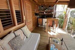 Nana Sakifo ist wirklich etwas besonderes. Er wurde ans Haus der Gastgeber angebaut und hat einen separaten Eingang. Sie betreten ihn über die überdachte Terrasse, die zugleich Salon ist, mit einer voll ausgestatteten Küche (Herd, Kühlschrank, Kaffeemaschine, Toaster, Geschirr und Besteck) und Esszimmer in einem. Bei alten kreolischen Häuschen ist es heute noch so, dass die Küche außenliegend ist. Somit haben Sie auch keine Kochgerüche im Zimmer.