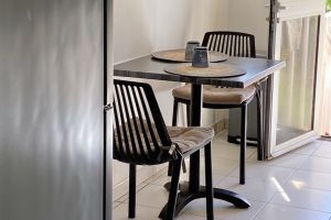 Die kleine Küche hat einen Ofen, einen Herd sowie eine Mikrowelle. Kühl- und Gefrierschrank, eine Nespresso-Maschine aber auch eine Kaffeekanne zum Pressen stehen bereit - Waschmaschine und Trockenständer ebenso. In der Küche kann man zu zweit frühstücken, es gibt hier auch eine Türe nach draußen, auf den Weg, der zum Pool hochgeht.