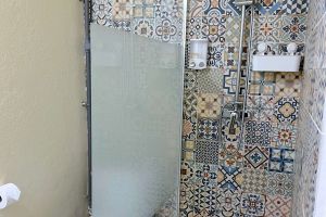Dahinter liegt dann das Badezimmer mit Dusche und Toilette.
