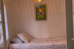 Die Bodenkacheln und auch die Holzböden in den Zimmern sind original. Rechts und links liegen gleich die ersten beiden Schlafzimmer für je 2 Personen mit 180 cm breiten (!) Doppelbetten. Im Anschluss, dahinter befindet sich noch ein weiteres Doppelzimmer mit einem Bett 160 cm und am Ende des Flurs ein Einzelzimmer (90x200cm).