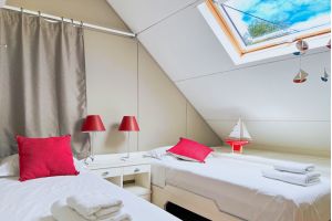 Die drei Schlafzimmer sind verteilt auf das Erdgeschoss und das Obergeschoss. Die Betten messen 180 cm in zwei der Zimmer und in einem Schlafzimmer gibt es zwei getrennte Betten mit jeweils 90 cm Breite.